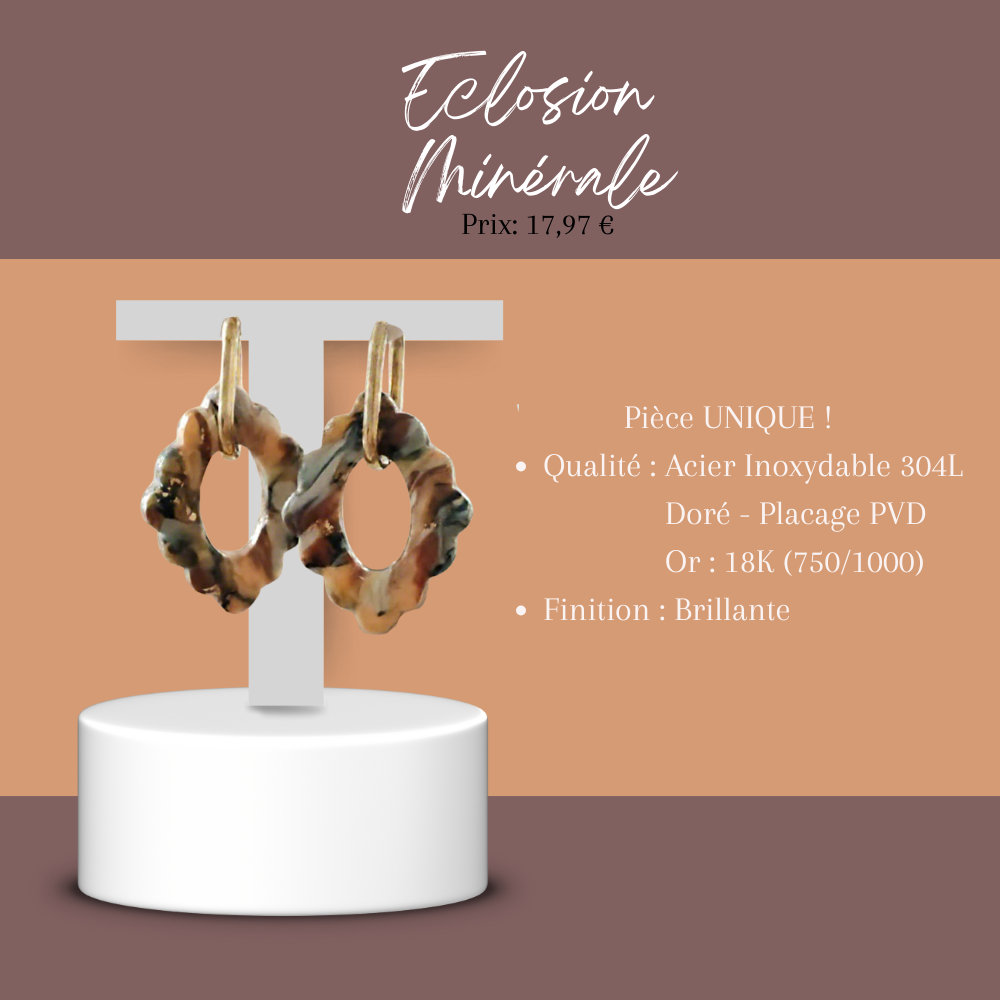Affirmez votre style avec les boucles d’oreilles « Éclosion Minérale ». Cette Pièce UNIQUE propose un design créole moderne et texturé, aux motifs rappelant les éclats de pierres semi-précieuses.