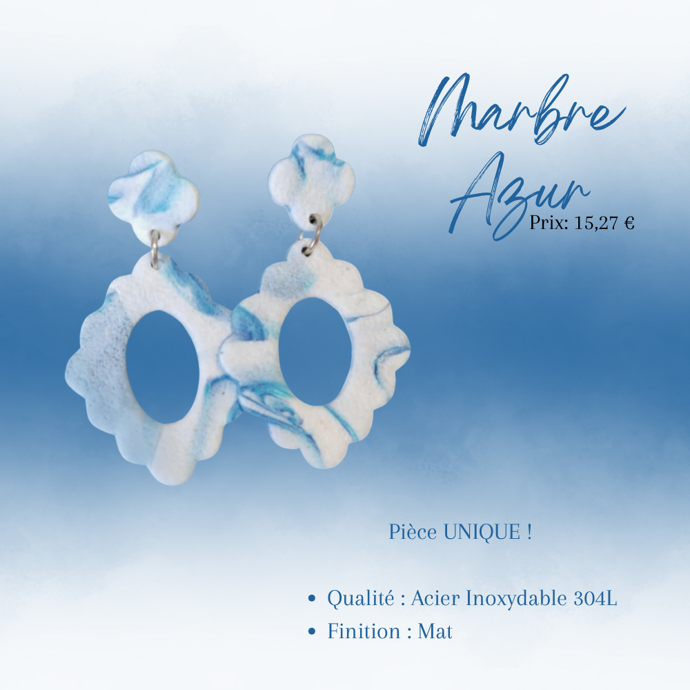Découvrez la délicatesse des boucles d’oreilles « Marbre Azur ». Cette Pièce UNIQUE évoque les motifs apaisants du ciel et de l’océan. La forme de goutte ajourée avec un bord légèrement festonné présente un magnifique motif marbré de bleu ciel et de blanc. Leur légèreté et leur finition mate en font le bijou parfait pour apporter une touche de douceur colorée et de style décontracté à votre tenue.